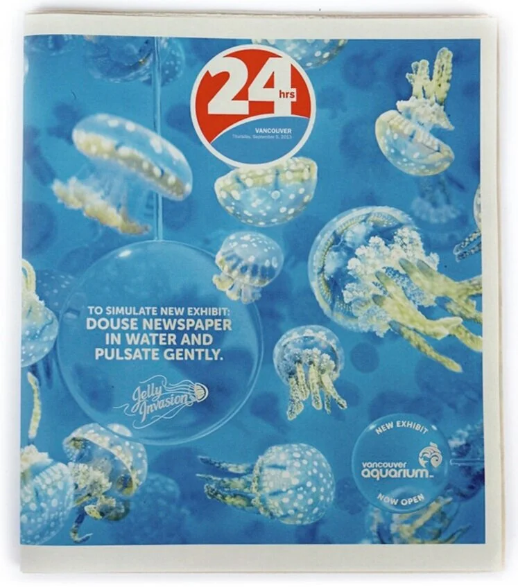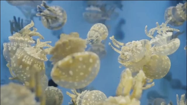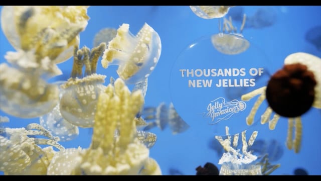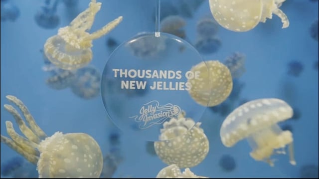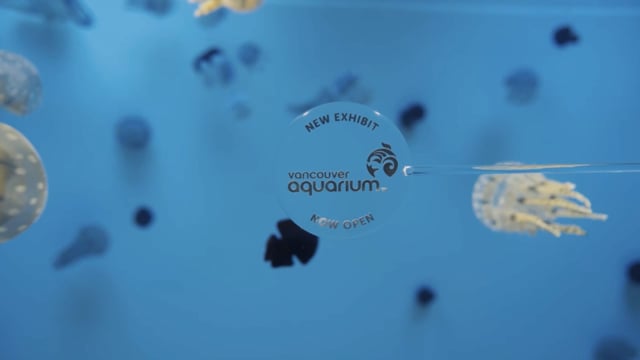 To show the photogenic qualities of the massive jelly exhibit and because we could, we dunked copy and logos in their tanks! Jellies won’t harm themselves on dull objects, but they are are terrible at taking direction, but pulling stills from 4K video gave us control over the composition of every media asset.